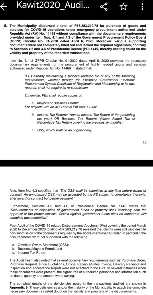 Kawit, Cavite — Ginastos ng munisipalidad ng Kawit ang kabuuang P67,283,219.78 para sa pagbili ng mga kagamitan at serbisyo para sa operasyon laban sa COVID-19 sa ilalim ng emergency procurement nang walang pagsunod sa kinakailangang mga dokumento, ayon sa ulat ng Commission on Audit (COA).