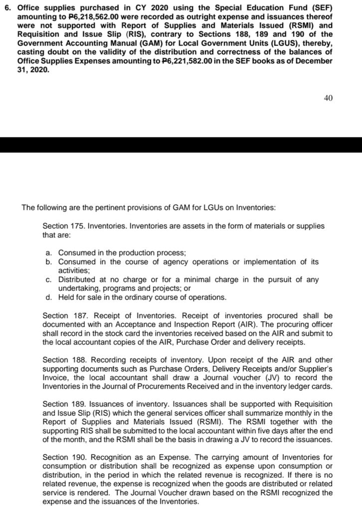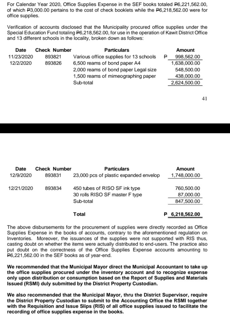 Wala ring suportang Report of Supplies and Materials Issued (RSMI) at Requisition and Issue Slip (RIS) ang mga transaksiyon, kaya nag-duda ang COA sa validity ng distribution at correctness ng balances ng Office Supplies Expenses na umabot sa ₱6,221,562.00 sa SEF books hanggang Disyembre 31, 2020.